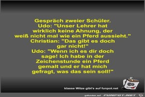 | Gespräch zweier Schüler Bild (42.36 KB) 6Lustiges → klasse Sprüche und Witze | Lustiges → klasse Sprüche und Witze | 01.08.21-19:47 | Fossy | |