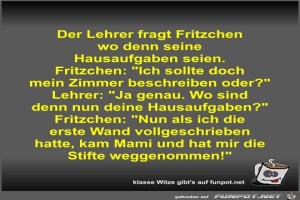 | Der Lehrer fragt Fritzchen wo denn seine Hausaufgaben seien Bild (51.25 KB) 9Lustiges → klasse Sprüche und Witze | Lustiges → klasse Sprüche und Witze | 30.07.21-12:13 | Fossy | |