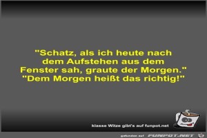 | Schatz, als ich heute nach dem Aufstehen aus dem Fenster... Bild (27.93 KB) 10Lustiges → klasse Sprüche und Witze | Lustiges → klasse Sprüche und Witze | 01.08.21-08:09 | Fossy | |