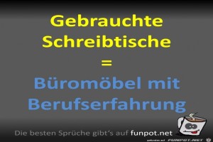 | Gebrauchte Schreibtische Bild (59.34 KB) 9Lustiges → klasse Sprüche und Witze Manche Büromöbel haben mehr Erfahrung als die Menschen, die an ihnen dran sitzen ;-) | Lustiges → klasse Sprüche und Witze | 26.07.21-10:35 | ||