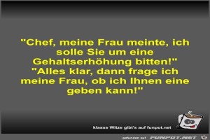 | Chef, meine Frau meinte, ich solle Sie um eine... Bild (33.69 KB) 7Lustiges → klasse Sprüche und Witze | Lustiges → klasse Sprüche und Witze | 25.07.21-08:30 | Fossy | |