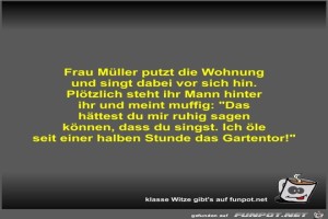 | Frau Müller putzt die Wohnung und singt dabei vor sich hin Bild (33.03 KB) 10Lustiges → klasse Sprüche und Witze | Lustiges → klasse Sprüche und Witze | 25.07.21-15:10 | Fossy | |
