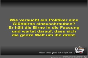 | Wie versucht ein Politiker eine Glühbirne einzuschrauben? Bild (34.07 KB) 8Lustiges → klasse Sprüche und Witze | Lustiges → klasse Sprüche und Witze | 26.07.21-08:12 | Fossy | |