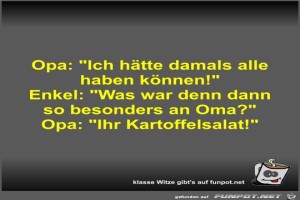 | Opa: "Ich hätte damals alle haben können!" Bild (32.36 KB) 9Lustiges → klasse Sprüche und Witze | Lustiges → klasse Sprüche und Witze | 24.07.21-14:36 | Fossy | |