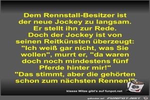 | Dem Rennstall-Besitzer ist der neue Jockey zu langsam Bild (55.67 KB) 6Lustiges → klasse Sprüche und Witze | Lustiges → klasse Sprüche und Witze | 20.07.21-12:15 | Fossy | |