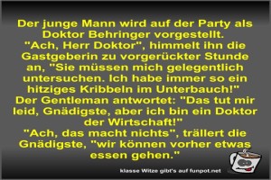 | Der junge Mann wird auf der Party als Doktor Behringer... Bild (66.14 KB) 1Lustiges → klasse Sprüche und Witze | Lustiges → klasse Sprüche und Witze | 06.05.-13:28 | Fossy | |