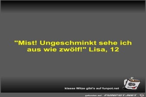 | "Mist! Ungeschminkt sehe ich aus wie zwölf!" Lisa Bild (19 KB) 9Lustiges → klasse Sprüche und Witze | Lustiges → klasse Sprüche und Witze | 16.07.21-08:14 | Fossy | |
