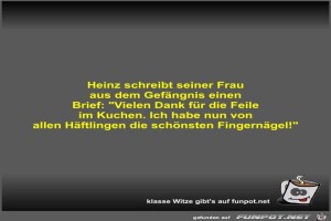 | Heinz schreibt seiner Frau aus dem Gefängnis einen Brief Bild (25.05 KB) 11Lustiges → klasse Sprüche und Witze | Lustiges → klasse Sprüche und Witze | 12.07.21-08:00 | Fossy | |