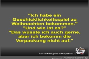| Ich habe ein Geschicklichkeitsspiel zu Weihnachten bekommen Bild (37.96 KB) 6Lustiges → klasse Sprüche und Witze | Lustiges → klasse Sprüche und Witze | 24.06.21-12:11 | Fossy | |