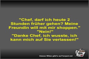 | Chef, darf ich heute 2 Stunden früher gehen? Bild (31.82 KB) 6Lustiges → klasse Sprüche und Witze | Lustiges → klasse Sprüche und Witze | 04.05.-17:33 | Fossy | |