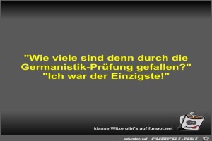 | Wie viele sind denn durch die Germanistik-Prüfung gefallen? Bild (24.27 KB) 7Lustiges → klasse Sprüche und Witze | Lustiges → klasse Sprüche und Witze | 08.06.21-10:54 | Fossy | |