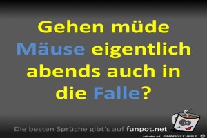 | Mäuse gehen in die Falle Bild (64.74 KB) 9Lustiges → klasse Sprüche und Witze Das wäre ja praktisch. Dann müsste man nur auf den Abend warten und die Mäuse würden automatisch in die Falle gehen ;-) | Lustiges → klasse Sprüche und Witze | 07.06.21-09:24 | ||