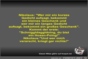 | Nikolaus: Wer mir ein kurzes Gedicht aufsagt Bild (38.99 KB) 5Lustiges → klasse Sprüche und Witze | Lustiges → klasse Sprüche und Witze | 05.06.21-13:40 | Fossy | |