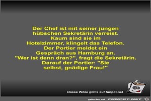 | Der Chef ist mit seiner jungen hübschen Sekretärin verreist Bild (35.92 KB) 8Lustiges → klasse Sprüche und Witze | Lustiges → klasse Sprüche und Witze | 08.06.21-13:40 | Fossy | |