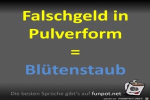 | Blütenstaub Bild (53.05 KB) 12Lustiges → klasse Sprüche und Witze Blütenstaub ist ja ein sehr niedlicher Ausdruck für pulverisiertes Falschgeld ;-) Ach und übrigens ist heute der Tag des Hundes! Also immer schön lieb sein zum Bello ;-) | Lustiges → klasse Sprüche und Witze | 02.06.21-16:06 | Fossy | |