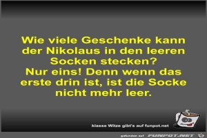 | Wie viele Geschenke kann der Nikolaus in den leeren Socken Bild (36.63 KB) 5Lustiges → klasse Sprüche und Witze | Lustiges → klasse Sprüche und Witze | 02.06.21-14:24 | Fossy | |