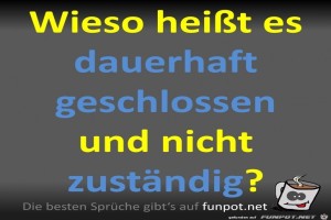 | Dauerhaft geschlossen Bild (68.28 KB) 10Lustiges → klasse Sprüche und Witze Zuständig würde so manch einer wahrscheinlich sogar besser verstehen als dauerhaft geschlossen ;-) | Lustiges → klasse Sprüche und Witze | 02.06.21-08:46 | ||