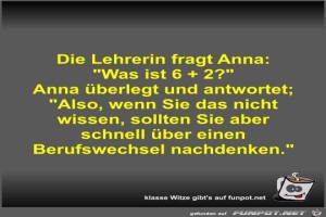 | Die Lehrerin fragt Anna Bild (38.25 KB) 11Lustiges → klasse Sprüche und Witze | Lustiges → klasse Sprüche und Witze | 26.05.21-10:50 | Fossy | |