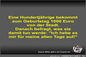 | Eine Hundertjährige bekommt zum Geburtstag 1000 Euro von... Bild (35.89 KB) 7Lustiges → klasse Sprüche und Witze | Lustiges → klasse Sprüche und Witze | 25.05.21-14:40 | Fossy | |
