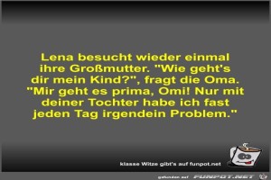 | Lena besucht wieder einmal ihre Großmutter Bild (38.29 KB) 13Lustiges → klasse Sprüche und Witze | Lustiges → klasse Sprüche und Witze | 13.05.21-15:12 | Fossy | |