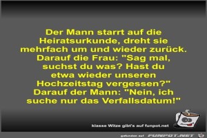| Der Mann starrt auf die Heiratsurkunde Bild (43.98 KB) 11Lustiges → klasse Sprüche und Witze | Lustiges → klasse Sprüche und Witze | 14.05.21-11:06 | Fossy | |