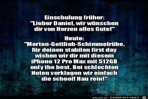 | Einschulung früher und heute Bild (110.95 KB) 15Lustiges → klasse Sprüche und Witze | Lustiges → klasse Sprüche und Witze | 16.05.21-08:43 | ||