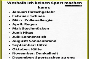 | Gründe keinen Sport zu machen Bild (64.83 KB) 4Lustiges → klasse Sprüche und Witze | Lustiges → klasse Sprüche und Witze | 02.05.-11:01 | Julia1991 | |