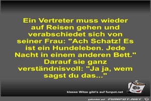 | Ein Vertreter muss wieder auf Reisen gehen und... Bild (45.4 KB) 10Lustiges → klasse Sprüche und Witze | Lustiges → klasse Sprüche und Witze | 11.05.21-08:00 | Fossy | |