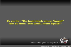 | Er zu ihr: "Du hast doch einen Vogel!" Bild (18.73 KB) 7Lustiges → klasse Sprüche und Witze | Lustiges → klasse Sprüche und Witze | 04.05.21-08:00 | Fossy | |