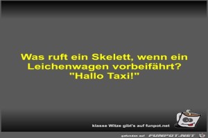 | Was ruft ein Skelett, wenn ein Leichenwagen vorbeifährt? Bild (21.93 KB) 8Lustiges → klasse Sprüche und Witze | Lustiges → klasse Sprüche und Witze | 30.04.21-08:01 | Fossy | |