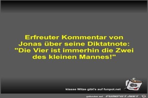 | Erfreuter Kommentar von Jonas über seine Diktatnote Bild (26.36 KB) 7Lustiges → klasse Sprüche und Witze | Lustiges → klasse Sprüche und Witze | 01.05.21-15:02 | Fossy | |