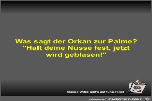 | Was sagt der Orkan zur Palme? Bild (22.65 KB) 7Lustiges → klasse Sprüche und Witze | Lustiges → klasse Sprüche und Witze | 30.03.21-08:20 | Fossy | |