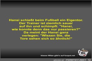 | Hansi schießt beim Fußball ein Eigentor Bild (33.12 KB) 5Lustiges → klasse Sprüche und Witze | Lustiges → klasse Sprüche und Witze | 30.03.21-14:21 | Fossy | |