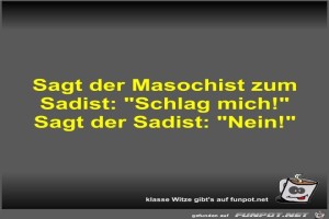 | Sagt der Masochist zum Sadist Bild (26.66 KB) 7Lustiges → klasse Sprüche und Witze | Lustiges → klasse Sprüche und Witze | 23.03.21-11:38 | Fossy | |