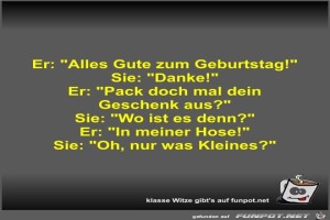 | Er: "Alles Gute zum Geburtstag!" Bild (33.16 KB) 9Lustiges → klasse Sprüche und Witze | Lustiges → klasse Sprüche und Witze | 21.03.21-11:33 | Fossy | |