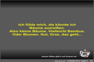 | Ich fühle mich, als könnte ich Bäume ausreißen Bild (24.32 KB) 8Lustiges → klasse Sprüche und Witze | Lustiges → klasse Sprüche und Witze | 16.03.21-13:40 | Fossy | |