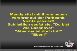 | Mandy sitzt mit ihrem neuen Verehrer auf der Parkbank Bild (33.95 KB) 10Lustiges → klasse Sprüche und Witze | Lustiges → klasse Sprüche und Witze | 17.03.21-13:53 | Fossy | |