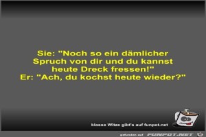 | Sie: Noch so ein dämlicher Spruch von dir und du kannst... Bild (25.27 KB) 9Lustiges → klasse Sprüche und Witze | Lustiges → klasse Sprüche und Witze | 14.03.21-13:03 | Fossy | |