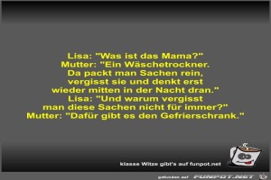 | Lisa: Was ist das Mama? Bild (34.38 KB) 6Lustiges → klasse Sprüche und Witze | Lustiges → klasse Sprüche und Witze | 13.03.21-13:42 | Fossy | |