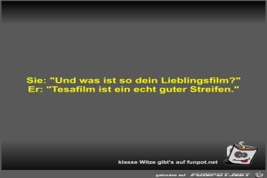 | Sie: Und was ist so dein Lieblingsfilm? Bild (18.56 KB) 6Lustiges → klasse Sprüche und Witze | Lustiges → klasse Sprüche und Witze | 07.03.21-08:03 | Fossy | |