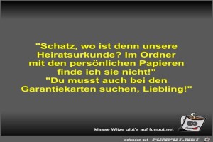 | Schatz, wo ist denn unsere Heiratsurkunde? Bild (32.95 KB) 5Lustiges → klasse Sprüche und Witze | Lustiges → klasse Sprüche und Witze | 03.02.21-08:00 | Fossy | |