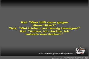 | Kai: Was hilft denn gegen diese Hitze? Bild (24.27 KB) 6Lustiges → klasse Sprüche und Witze | Lustiges → klasse Sprüche und Witze | 02.02.21-08:17 | Fossy | |