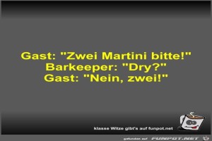 | Gast: "Zwei Martini bitte!" Bild (22.77 KB) 10Lustiges → klasse Sprüche und Witze | Lustiges → klasse Sprüche und Witze | 01.02.21-08:00 | Fossy | |