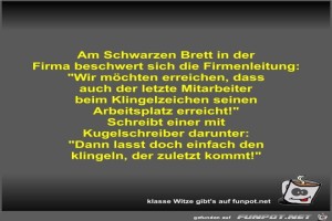 | Am Schwarzen Brett in der Firma beschwert sich die... Bild (40.69 KB) 4Lustiges → klasse Sprüche und Witze | Lustiges → klasse Sprüche und Witze | 08.01.21-08:03 | Fossy | |