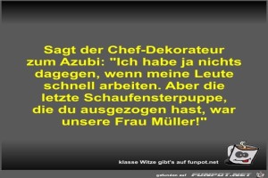 | Sagt der Chef-Dekorateur zum Azubi Bild (39.84 KB) 9Lustiges → klasse Sprüche und Witze | Lustiges → klasse Sprüche und Witze | 09.01.21-11:57 | Fossy | |