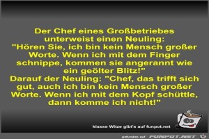 | Der Chef eines Großbetriebes unterweist einen Neuling Bild (52.38 KB) 7Lustiges → klasse Sprüche und Witze | Lustiges → klasse Sprüche und Witze | 10.01.21-10:52 | Fossy | |