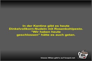 | In der Kantine gibt es heute Dinkelvollkorn-Nudeln mit... Bild (22.32 KB) 1Lustiges → klasse Sprüche und Witze | Lustiges → klasse Sprüche und Witze | 24.04.-11:03 | Fossy | |