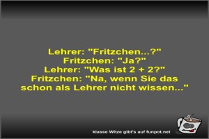 | Lehrer: Fritzchen Bild (27.52 KB) 1Lustiges → klasse Sprüche und Witze | Lustiges → klasse Sprüche und Witze | 23.04.-18:05 | Fossy | |