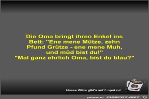 | Die Oma bringt ihren Enkel ins Bett Bild (27.24 KB) 7Lustiges → klasse Sprüche und Witze | Lustiges → klasse Sprüche und Witze | 22.12.20-11:04 | Fossy | |