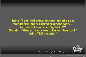 | Ich: Ich möchte einen mittleren fünfstelligen Betrag... Bild (27.52 KB) 9Lustiges → klasse Sprüche und Witze | Lustiges → klasse Sprüche und Witze | 20.12.20-08:00 | Fossy | |